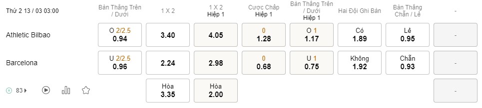 Tỉ lệ kèo Bilbao vs Barcelona