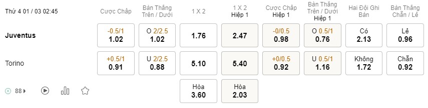 Soi kèo tài xỉu Juventus vs Torino: 1.02*2/2.5*0.88