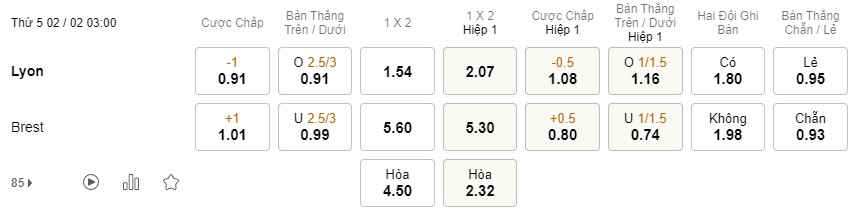 Soi kèo hiệp 1 Lyon vs Brest: 1.08*0.5*0.80