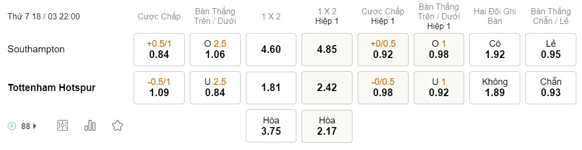 Soi kèo hiệp 1 Southampton vs Tottenham: 0.92*0/0.5*0.98