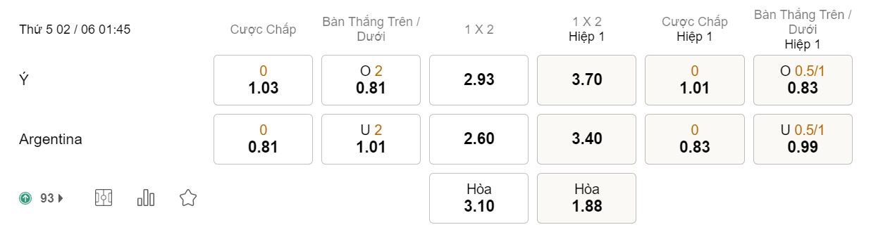Soi kèo hiệp 1 Ý vs Argentina: 1.01*0*0.83